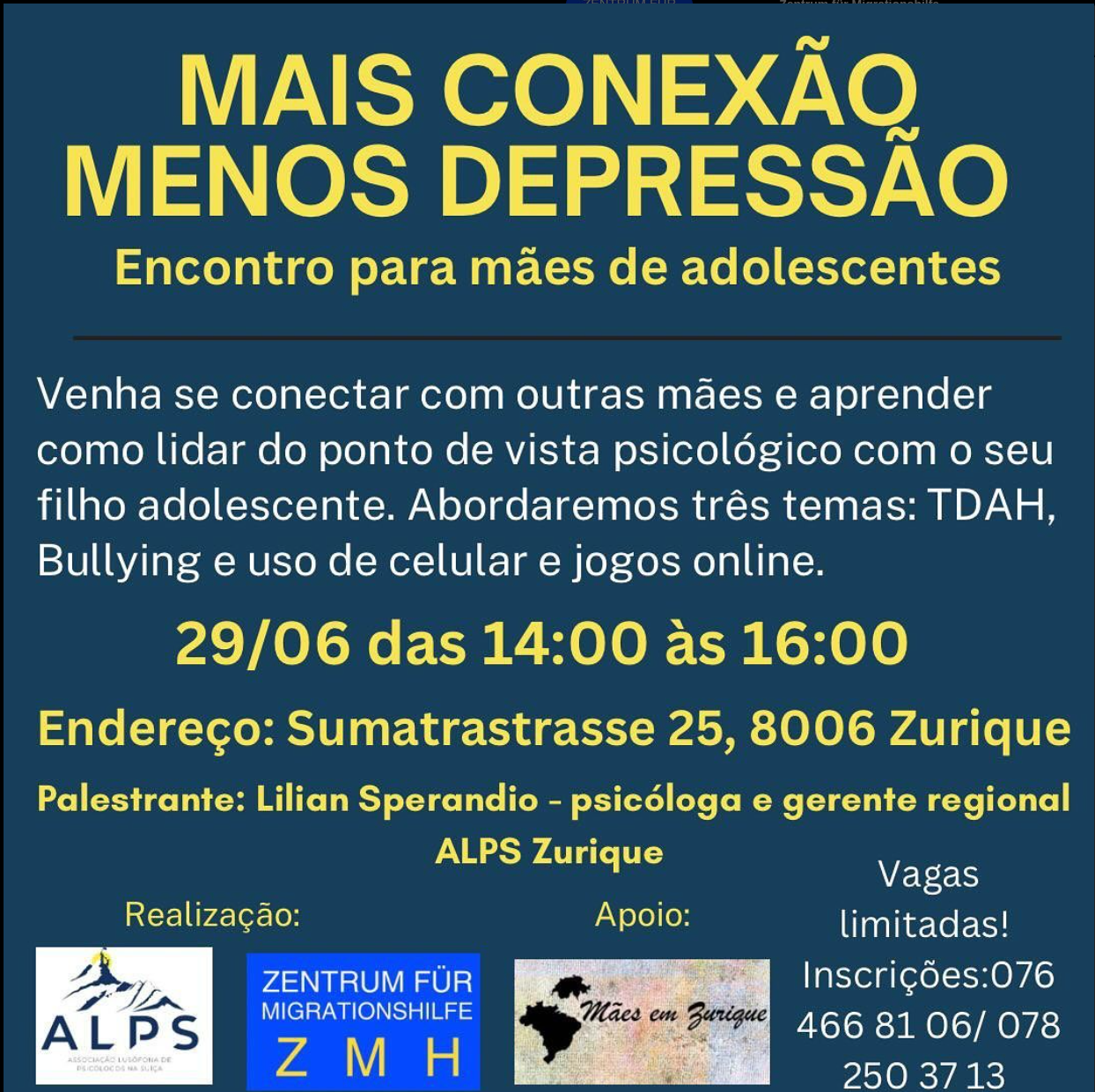 Mehr InfoMEHR VERBINDUNG, WENIGER DEPRESSION Treffen für Mütter von Teenagern Kommen Sie, um sich mit anderen Müttern auszutauschen und zu erfahren, wie Sie mit Ihrem Teenager aus psychologischer Sicht umgehen können. Wir werden drei Themen behandeln: ADHS, Mobbing und die Nutzung von Handys und Onlin…